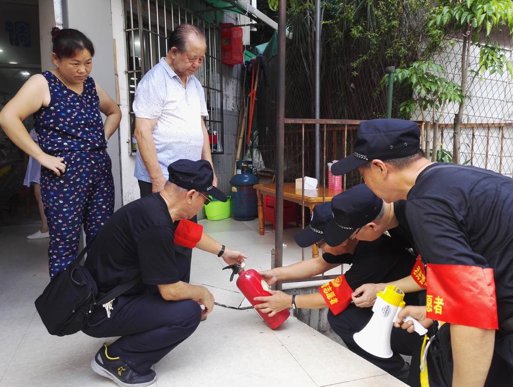 阳台山社区的老民警志愿者在沿街店面中,发现了一些店家的灭火器缺失损坏或者灭火材料过期,他们耐心地讲明消防安全利人利己的意义和必要性,让存在隐患问题的店家心服口服地接受整改。