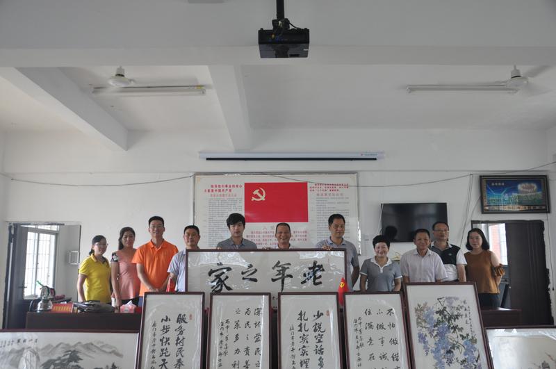 局领导多次要求下村蹲点人员要做三沉式干部,尽力为村里办事实,做好事。当第三批下村蹲点人员得知村部办公楼和村老年活动中心均无书画的情况后,主动联系村两委领导,提出帮助布置一批字画,既可为村民励志鼓劲,又能增添活动场所的文化氛围。局机关党委和教育活动处紧锣密鼓地组织市老干部书画社的几位社长进行现场创作,一批贴近村民生活、催人奋进的书法作品如“服务村民,奉献美好,小步快跑,天天进步”、“少说空话,多做工作,扎扎实实,埋头苦干”和一批精美山水、花鸟画创作完成,并精心装裱好再配上精美的实木框,偏远山村立马增添了书香气。