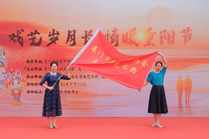 市文联党组书记柯碧如向厦门市戏剧家协会志愿者艺术团授团旗。