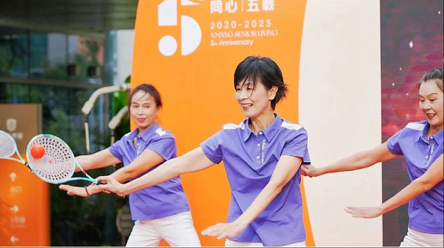 在象屿慈爱养护中心,厦门老年大学20名师生志愿者登台献艺,为长者们送上温情祝福。柔力球队学员手持彩球翩然起舞,转身、挥拍、抛接间行云流水、配合默契,以灵动飒爽的姿态传递积极向上的生命活力;健身气功师资班学员手执养生杖,身姿挺拔、招式沉稳有度,将传统养生智慧与艺术表演相融合,尽展银发风采,赢得现场阵阵掌声。