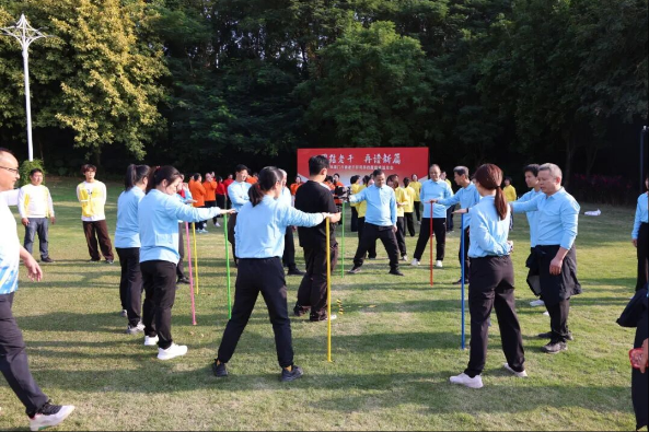 不倒森林:十人围圈,各执一杆。右手掌心抵杆,听令齐放齐接,循环向前。杆不能倒,手不可松,瞻前顾后才能又好又快,节奏一致方能茂密成“林”。赛场上队员们目光专注、步伐协调,每一次成功传递都引来阵阵喝彩,团队的默契在移步接杆间悄然凝聚。