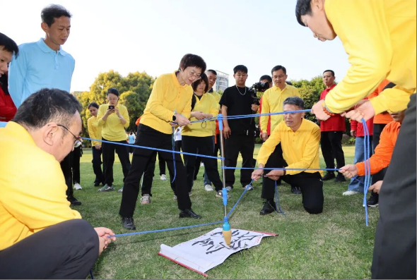 神笔马良:六人执绳,共握一笔。绳末不得越界,笔杆不可触碰,全凭团队协作在纸上书写“老干”二字。你拉我稳,他提我按,字迹或许“稚拙”,心意却真诚无比。这一刻,沟通在绳间传递,团结在笔下汇聚。