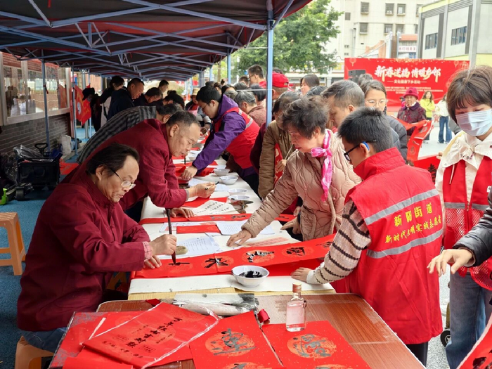 活动现场气氛热烈,年味十足。一副副寓意吉祥的春联和一个个饱满的“福”字跃然纸上。机关青年志愿者们协助准备材料、维持秩序,并将一幅幅墨迹未干、饱含温情的春联小心晾干后送到居民手中。现场欢声笑语,其乐融融,洋溢着喜庆祥和的氛围。