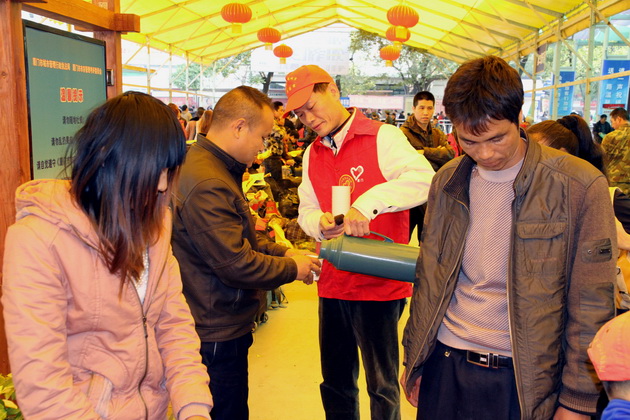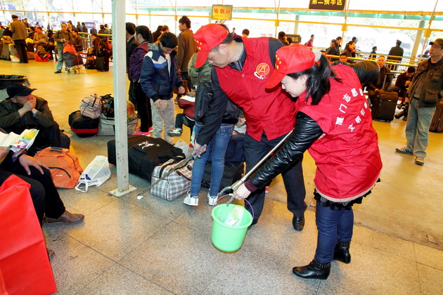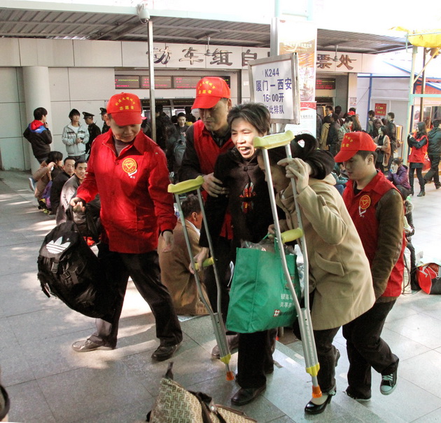 为了帮助农民工平安返乡,春运期间,市委老干部局组织党员、干部、职工组成志愿者服务队,头戴小红帽,身穿红马夹,活跃在厦门火车站候车广场。在进站口提醒旅客准备好车票和身份证;在候车大厅维持秩序,捡拾垃圾;帮助老弱病残孕妇等困难旅客提携行李,引导走绿色通道进站上车;协助旅客自助购票、取票;为广场候车旅客送水,免费提供应急药品;对旅客的咨询予以答复或指引至铁路咨询点。在寒风瑟瑟的火车站,为旅客春节返乡途中增添了丝丝暖意。对于返家的农民工来说,春运回家的路途艰辛,但志愿者热忱的服务为他们送去了寒冬中的温暖,让他们也体验到“奉献、友爱、互助、进步”的志愿精神。