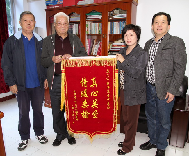 市委老干部局副局长王秀珠向市老年基金会会长林源赠送锦旗