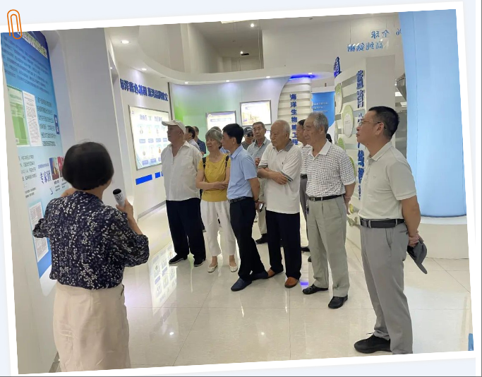 当日,老干部们来到海沧区蓝湾科技有限公司展厅,听取工作人员的细致讲解,了解了园区的整体布局、发展定位以及尖端产品。在蓝湾海洋多糖展示区,工作人员重点介绍了蓝湾科技有限公司在壳寡糖、壳聚糖、硒化卡拉胶等创新药物研发领域的技术突破和产品应用。老干部们不时驻足观看,与工作人员亲切交流,详细询问企业的研发投入、市场前景、产品功效等情况,对海洋多糖产业的快速发展和取得的成就表示高度赞赏。他们纷纷表示,通过此次参观,不仅直观感受到海沧区在生物医药产业发展上的强劲势头和广阔前景,也深刻体会到区委区政府在推动产业高质量发展方面所做的努力。